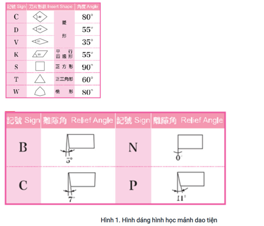 – Mảnh dao: phân loại theo hình dáng như hình 1 và hình chiếu cạnh mảnh dao với tùng góc cạnh khác nhau. Tùy mục đích gia công mà chúng ta chọn mảnh dao phù hợp.