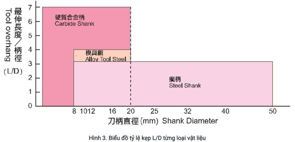 Tùy theo chiều sâu lỗ gia công và đường kính lỗ, ta chọn tỷ lệ L/D phù hợp theo biểu đồ. Tuy nhiên do giá thành vật liệu carbide đắt hơn rất nhiều so với thép nên cán có đường kính lớn hơn 20mm đều là cán thép.