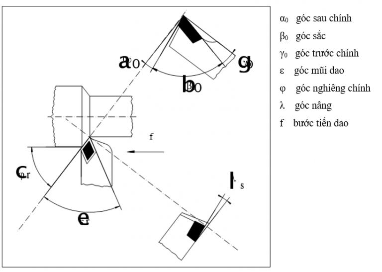 Góc mũi dao ε: góc mũi dao càng lớn thì lưỡi cắt càng cứng vững và thoát nhiệt tốt hơn.