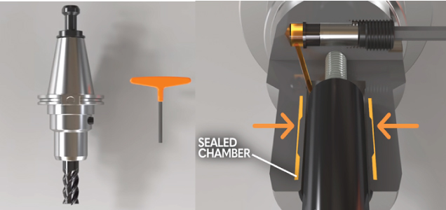 + Cán dao thủy lực có tính năng khử rung rất tốt. Bằng cách siết ốc vào lỗ dầu, dầu thủy lực được đẩy vào hệ thống đến các khoang xung quanh dao. Áp suất sẽ ép lên xung quanh dao giữ nó đúng vị trí.