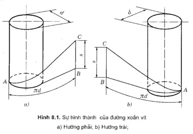Hình tam giác đó có thể quấn theo chiều kim đồng hồ hoặc ngược chiều kim đồng hồ. Khi quấn vào mà đường cong đi lên dần theo bên phải (a) thì gọi đó là đường xoắn phải (hướng ren phải), còn đường cong đi lên theo bên trái (b) thì gọi là đường xoắn trái (hướng ren trái).
