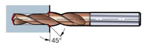 Dùng mũi khoan với 2 tiêu chuẩn khoan lỗ và vát mép đồng thời dạng hợp kim nguyên khối (solid carbide drills and Chamfering), hoặc dao thép gió (Hss drills and Chamfering), lưỡi cắt đường kính 2 với góc 45º, 30º hoặc 60º vị trí vát góc này phù hợp để khi khoan đạt độ sâu lỗ thì sẽ đạt mép vát góc 45º, 30º hoặc 60º